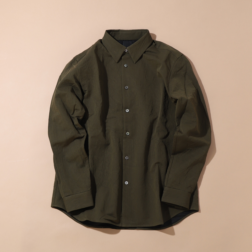 有松絞りの職人による塩縮加工を施した近江産のコットンリネンを表地に使用した人気定番シャツ。シャツでは珍しいコットンキュプラを裏打ちした山内らしい縫製も魅力のひとつ。