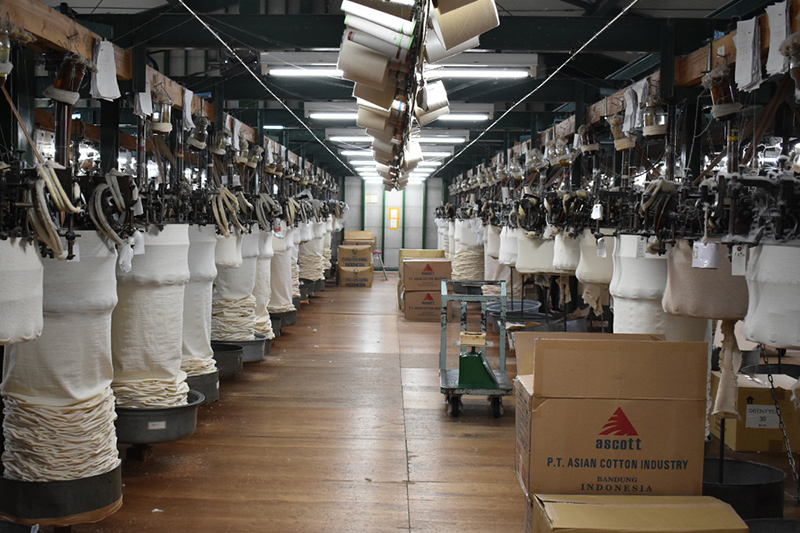 1960年以前アメリカで主流であった吊り編み。吊り編みとは生地を吊って編んでゆく方法で、そのスピードは1時間にたった1m前後。一般のシンカーと呼ばれる高速機と比べると約1/30程度です。